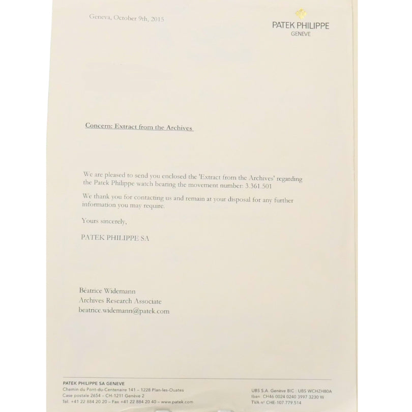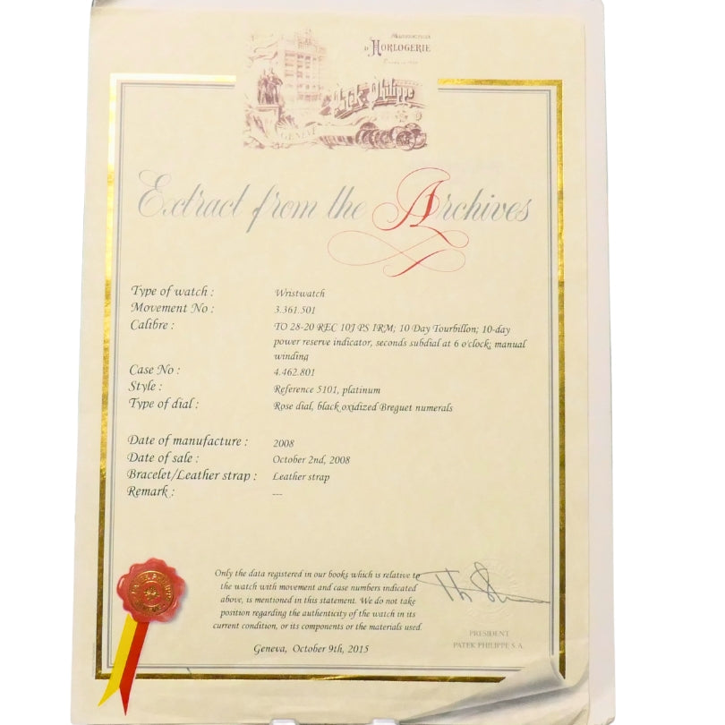 This particular watch retains its original Patek Philippe brown alligator leather strap, complementing the platinum case and warm dial tones perfectly. With its combination of distinctive design and technical innovation, Reference 5101P stands as one of Patek Philippe’s most iconic and collectible modern timepieces. Comes with an “Extract from the Archives," a transcript taken directly from the manufacturer's historical archives.