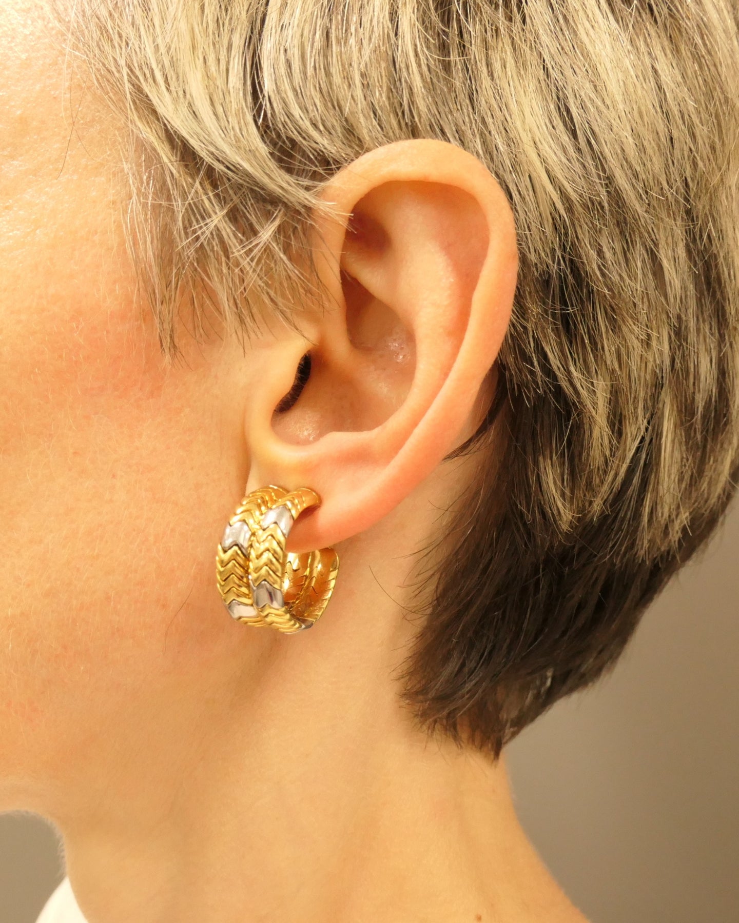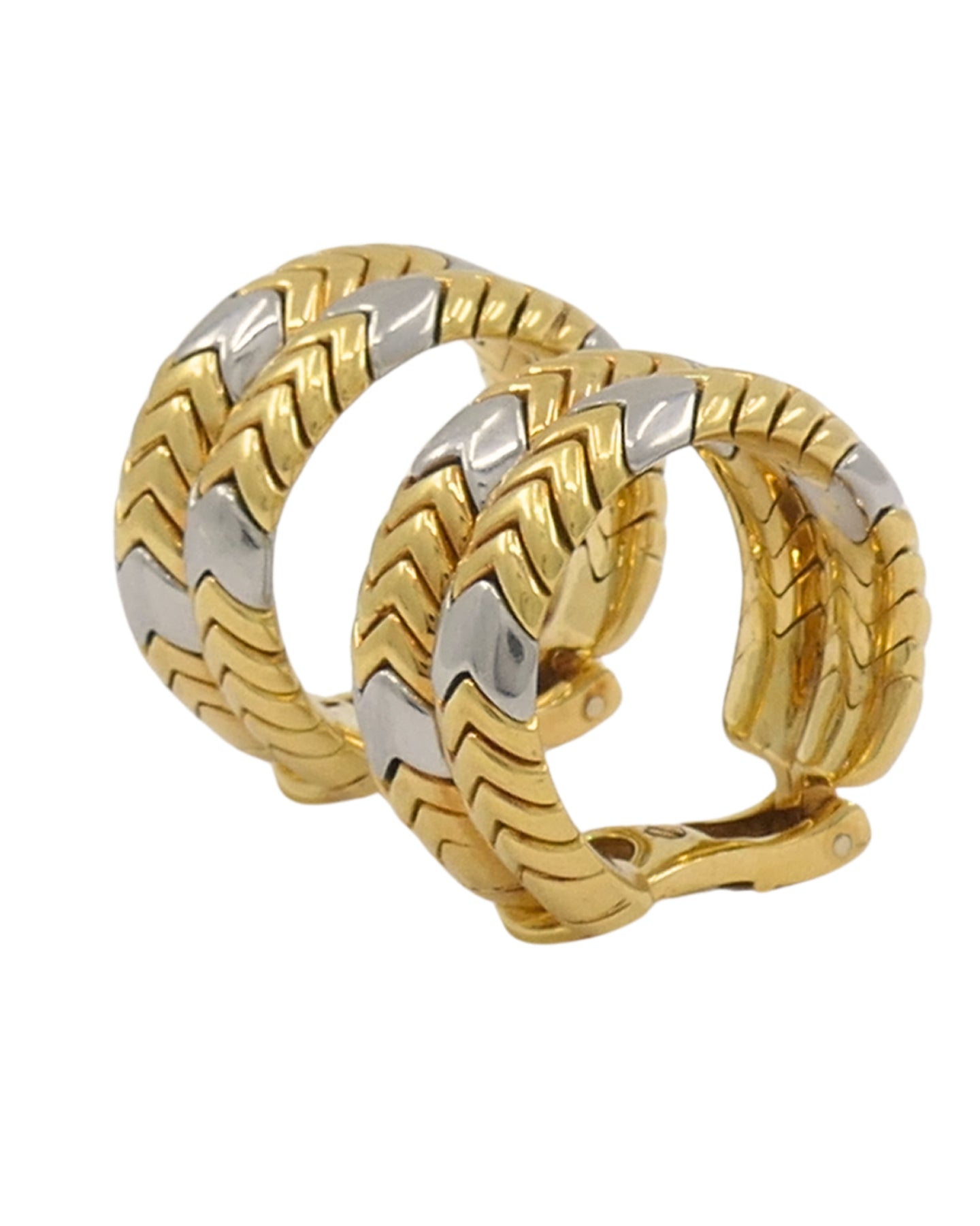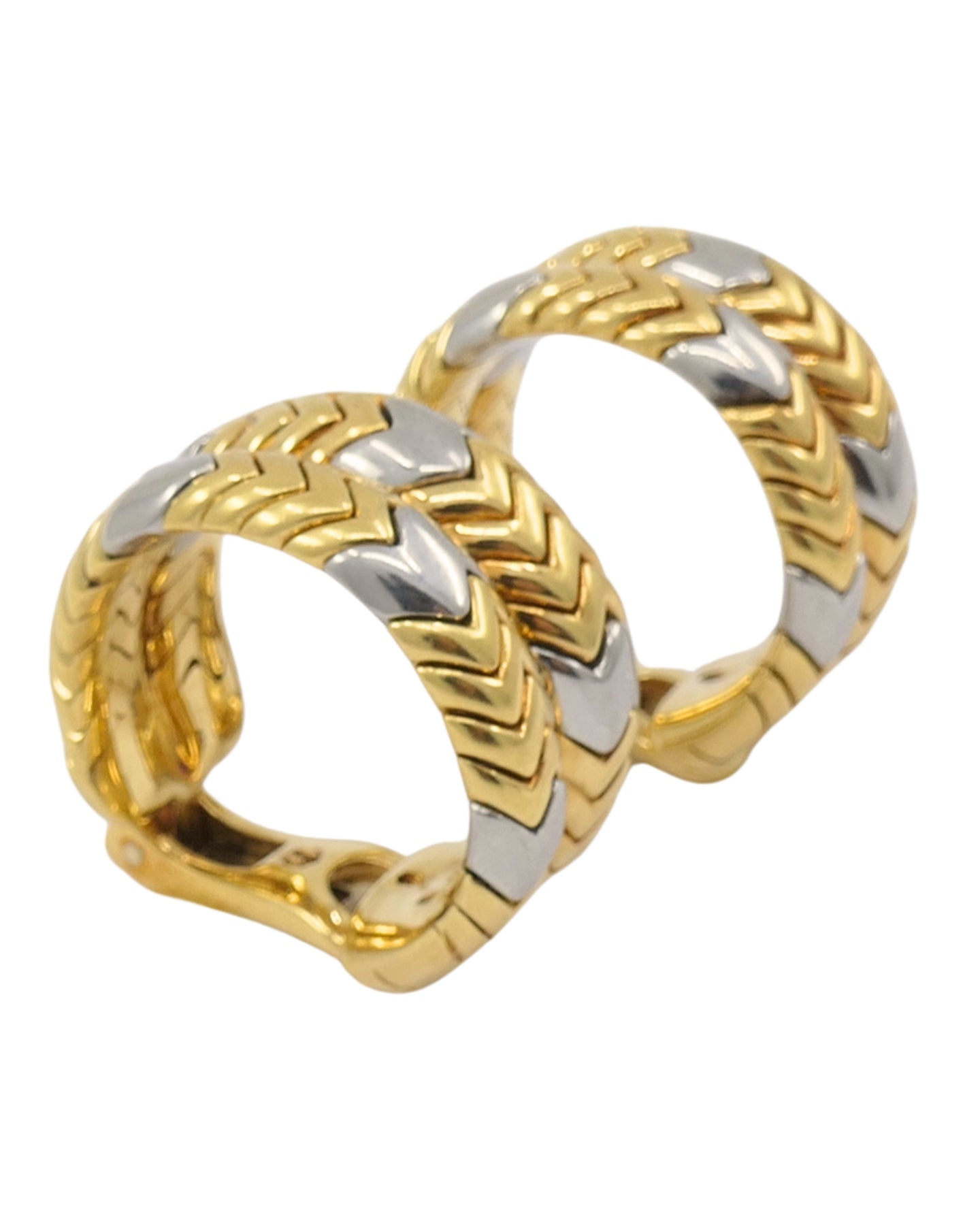 A pair of Bulgari Spiga hoop earrings, made from 18k yellow and white gold, featuring the signature chevron pattern that defines the Bulgari Spiga collection. The alternating gold tones highlight the woven design. The chevron links create a pattern that feels both classic and modern.