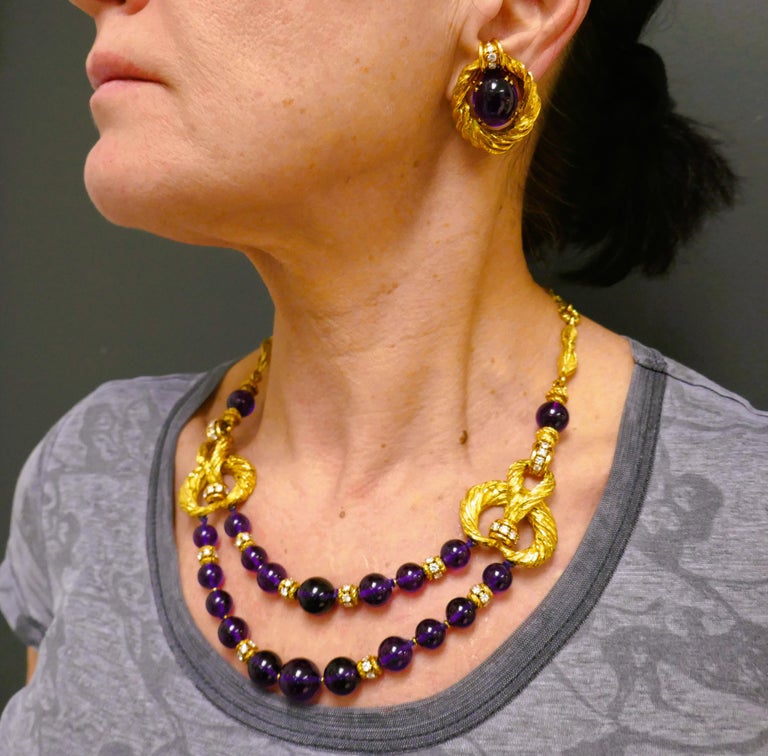 A spectacular vintage set by Chaumet, made of 18k gold, featuring amethyst and diamond. The set consists of a beaded necklace and a pair of earrings. The necklace has an intricate design that includes textured gold elements, diamond rondelles, and graduated amethyst beads. The earrings have similar textured gold rope elements that frame prong set cabochon amethysts. The space between the gem and the frame creates an airy feel. Along with the chunky gold, it provides a unique look to these Chaumet earrings.This vintage set works great for a night out. Or you can wear earrings separately to dress up your business outfit.