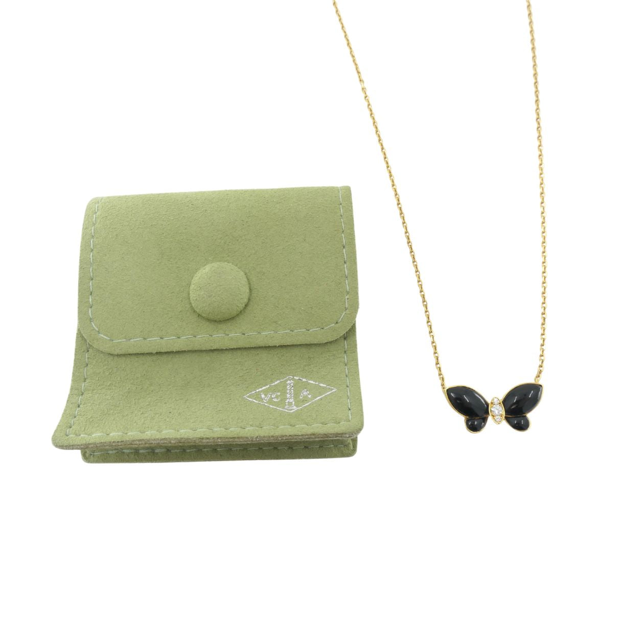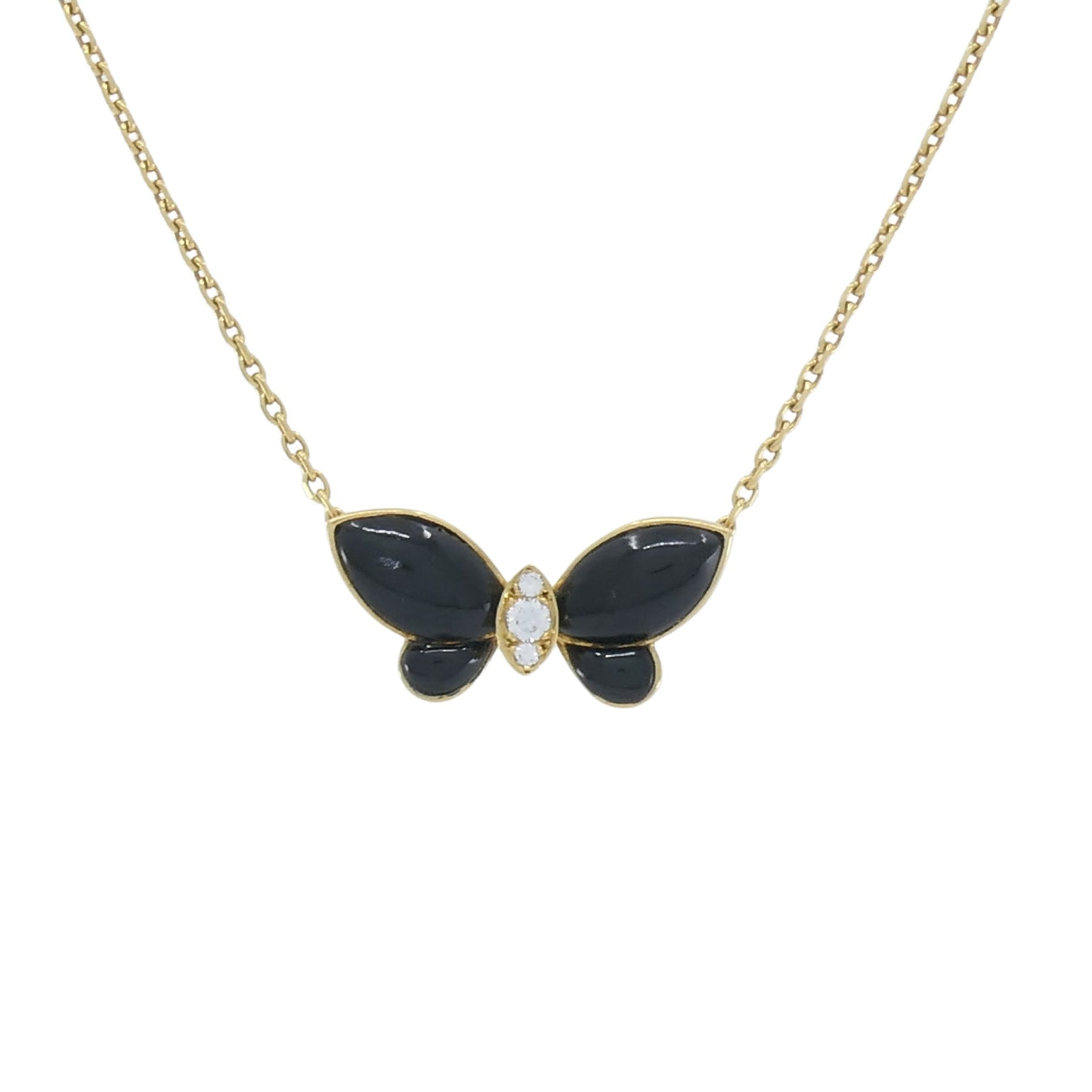 Van Cleef & Arpels onyx and diamond butterfly necklace crafted in 18K yellow gold, circa 2000s. The butterfly features polished onyx wings and a center set with a 0.08-carat round brilliant cut diamond. The butterfly measures 7/16 inch by 7/8 inch. The chain measures 16 inches and includes an additional jump ring for adjustable length. The necklace weighs 5.1 grams. Hallmarks include VCA, 18K, B4398x11, and 0,08. Includes the original pouch.