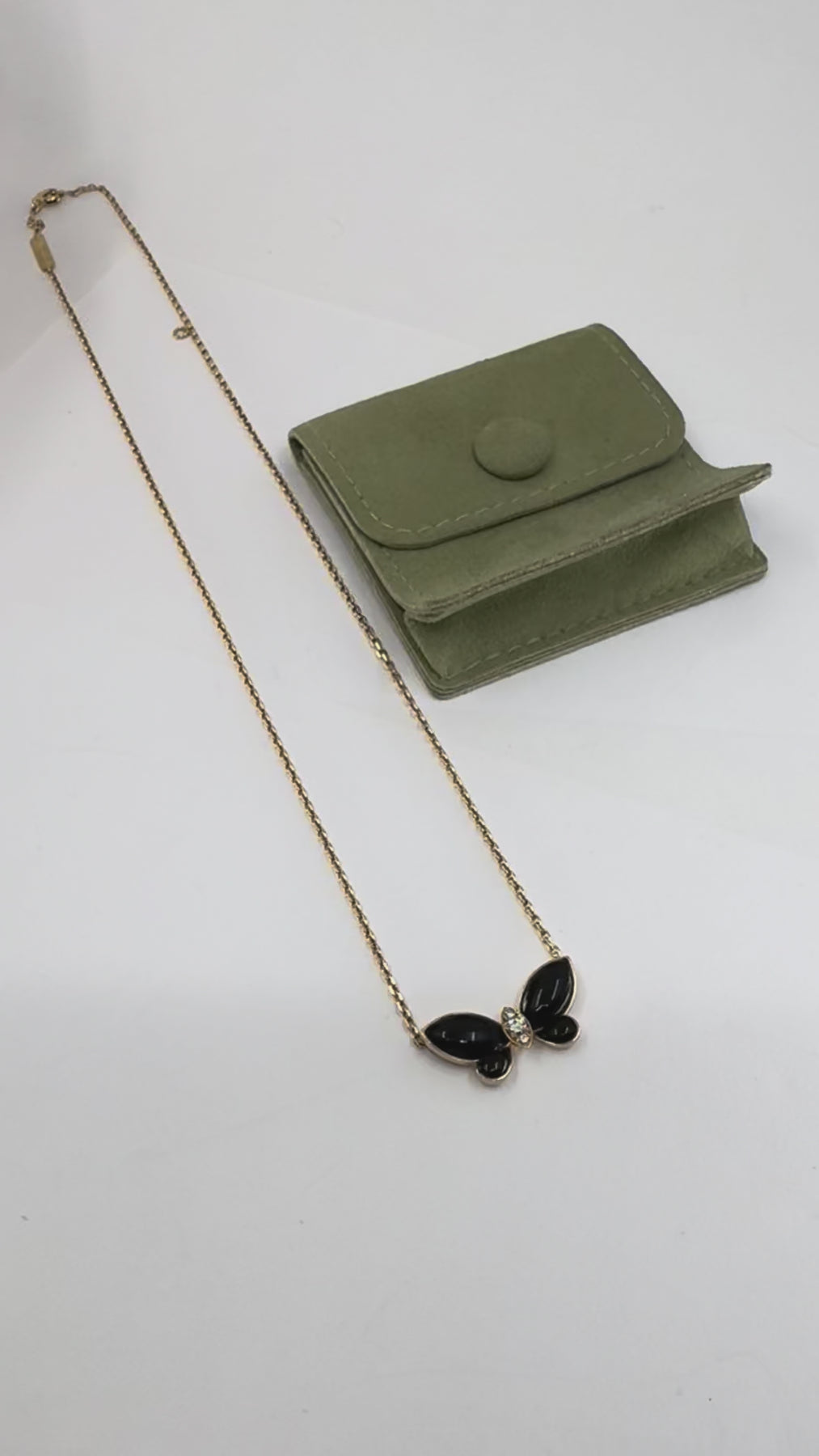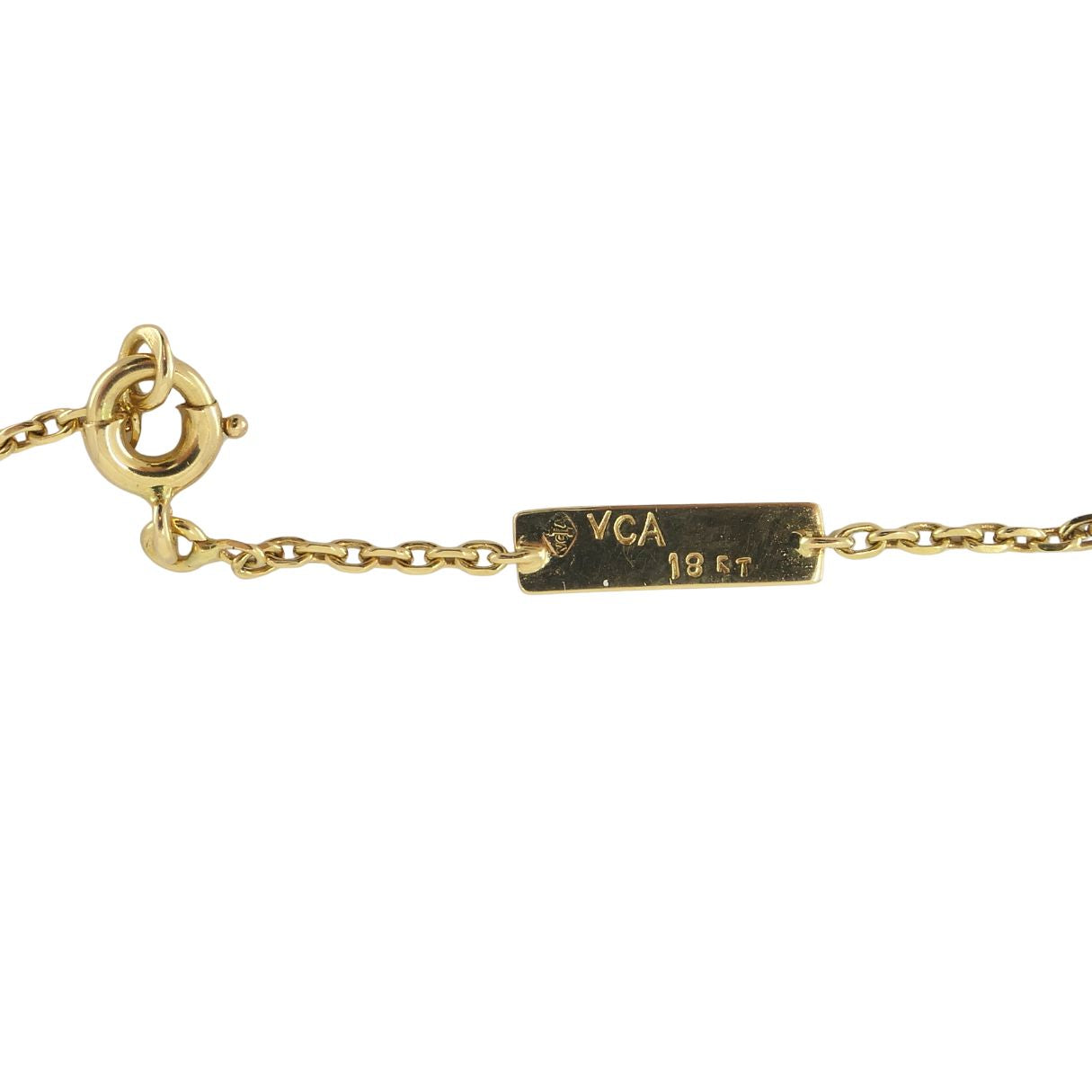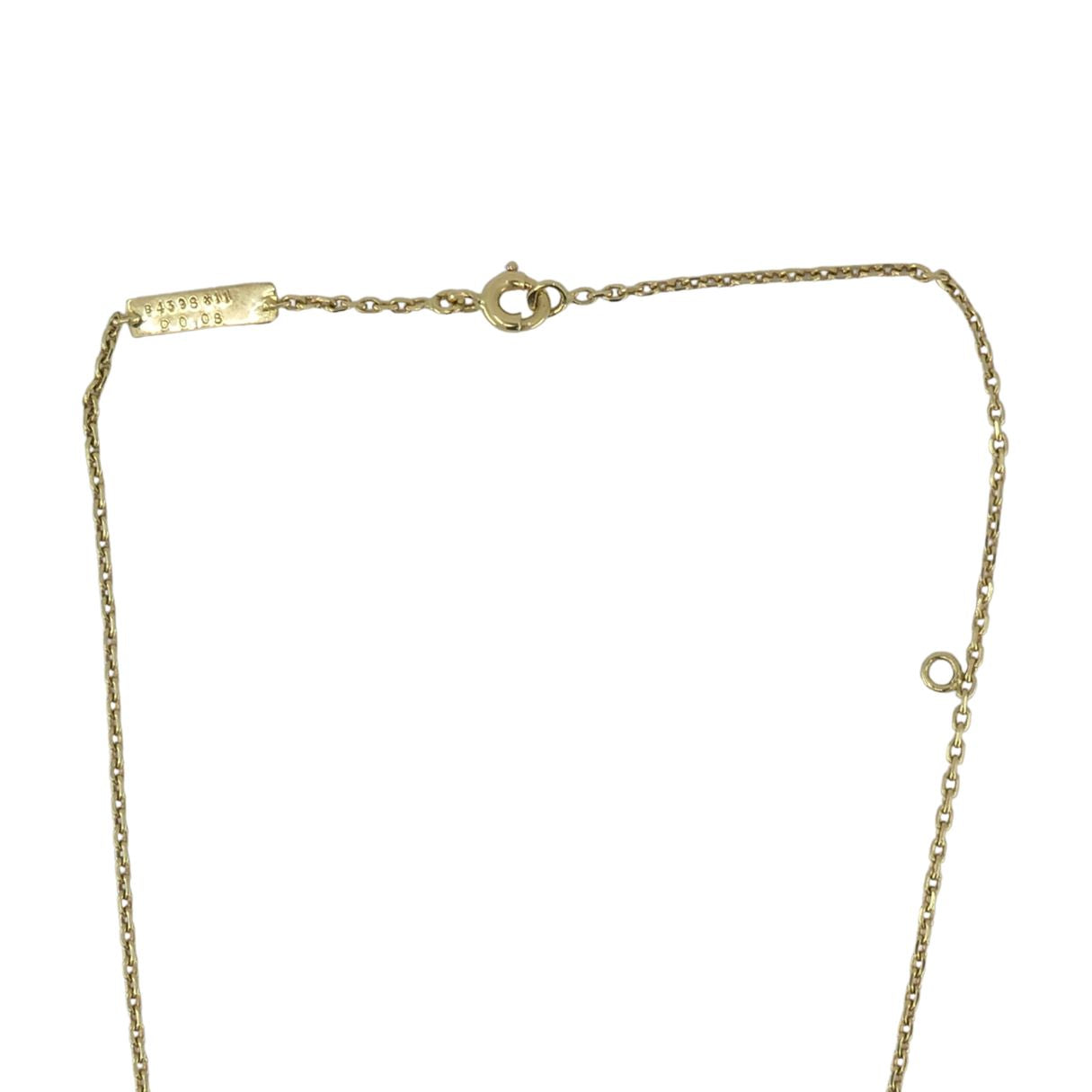 The dating of this piece is supported by the hallmark format, the modern chain construction with an integrated adjustment jump ring, and the clasp style, all of which correspond to Van Cleef & Arpels production from the early 2000s onward. The butterfly motif has long been part of the maison’s design language, symbolizing transformation and movement. In the early 2000s, VCA introduced updated butterfly creations pairing hardstones with diamond accents in clean, refined silhouettes, a direction reflected in this necklace’s design.
