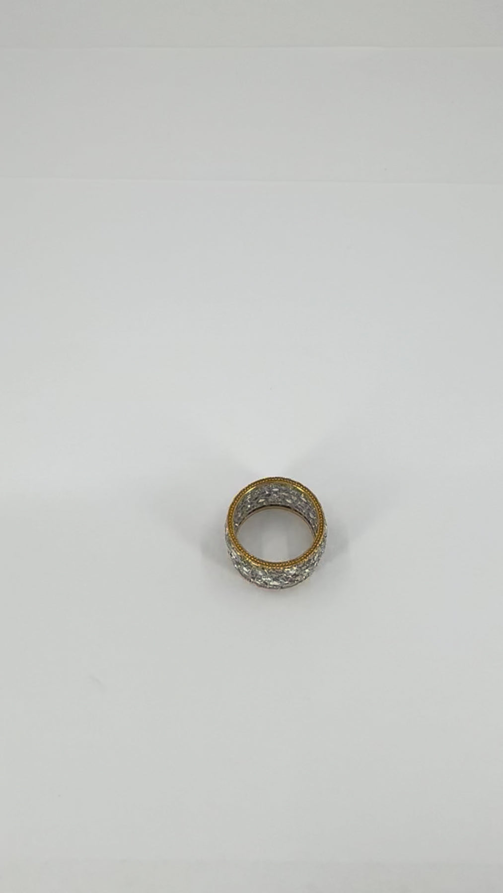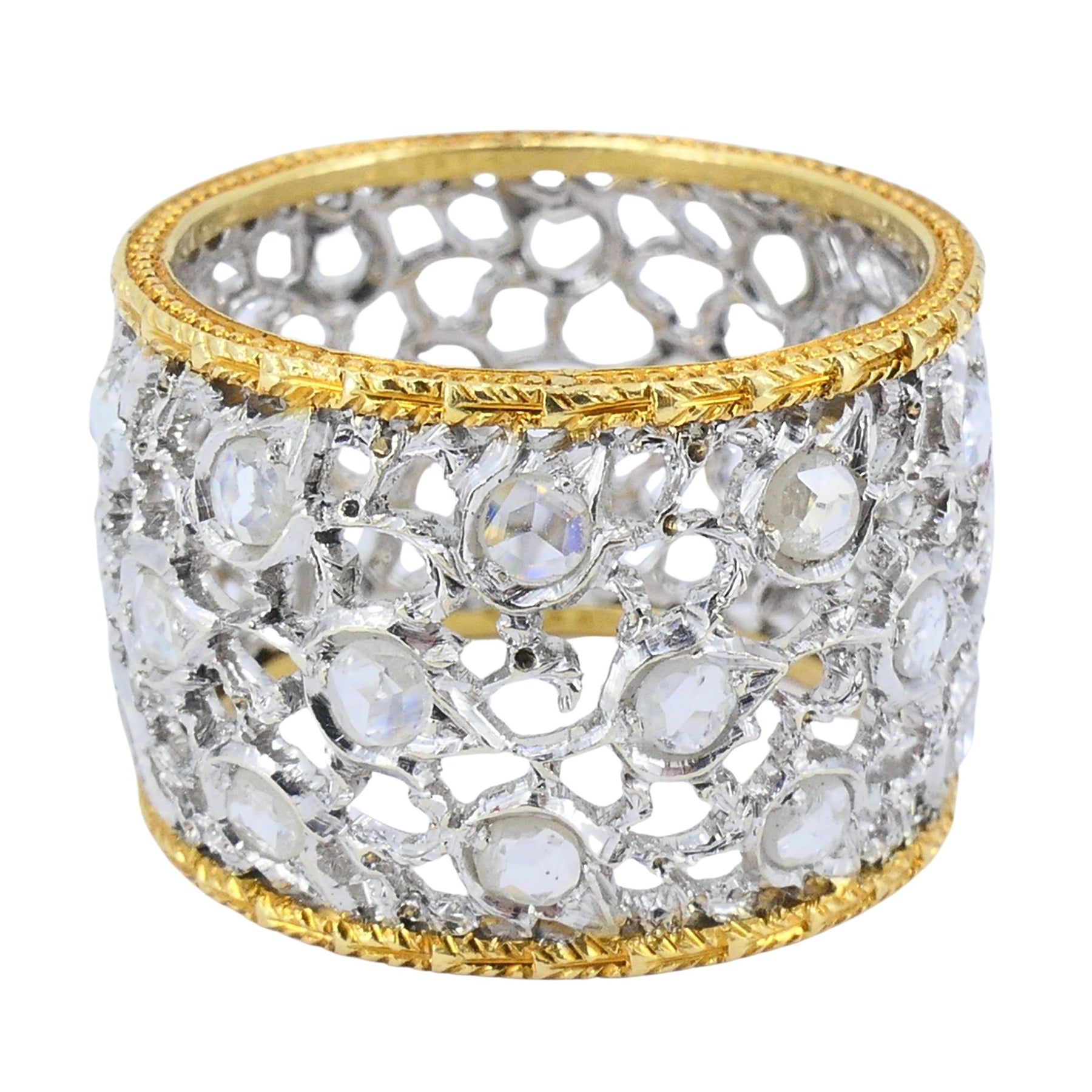 This vintage Gianmaria Buccellati 18k two-tone gold diamond band ring exemplifies the house’s masterful approach to texture and design. Crafted in Italy circa 1980s, the ring showcases Buccellati’s signature openwork lattice pattern, where 18k white gold is pierced and set with rose-cut diamonds to create a delicate, lace-like effect. The edges are framed in rich 18k yellow gold, enhanced with fine hand-engraved details that highlight the brand’s recognizable style. Measuring 1/2 inch in width and weighing 5.8 grams, the band offers a bold yet wearable silhouette. The ring is a size 5, and not resizable.