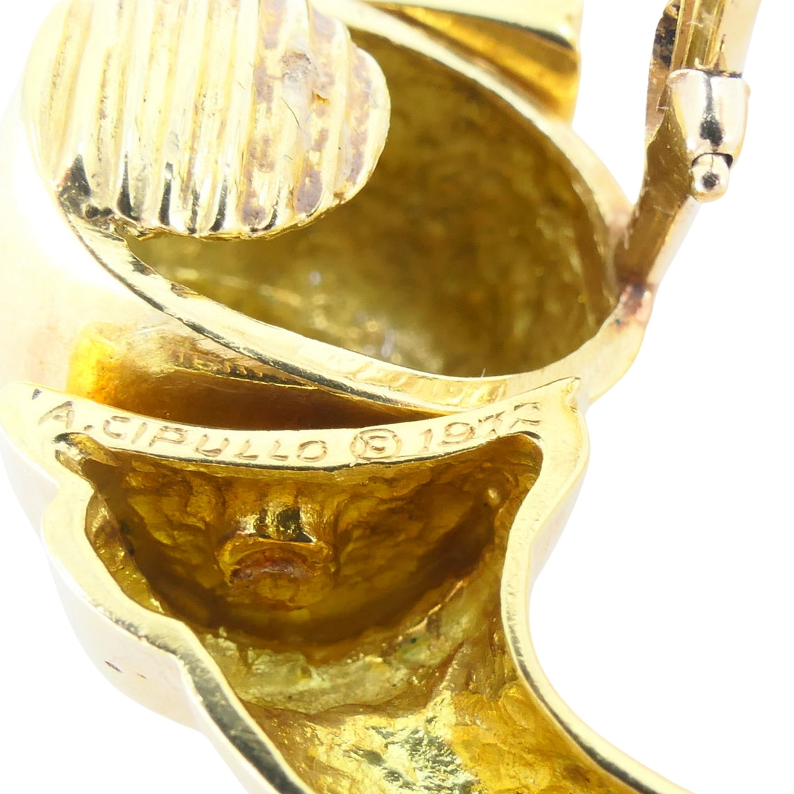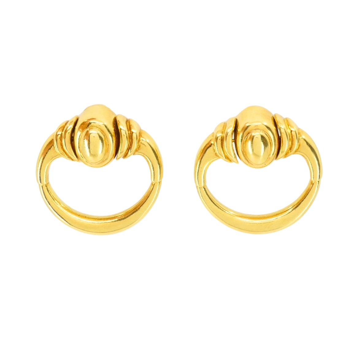 These vintage 18k gold earrings were designed by Aldo Cipullo for Cartier in the 1970s and feature his signature bold and sculptural approach to jewelry. Shaped like door knockers, they have a smooth oval top and flared edges that transition into a curved hoop. The design plays with weight and proportion, giving the earrings a strong look. The gold's polished finish complements the sculptural lines. A classic example of Cipullo’s work for Cartier, these earrings reflect the clean, modern aesthetic that made his designs so distinctive during the era.